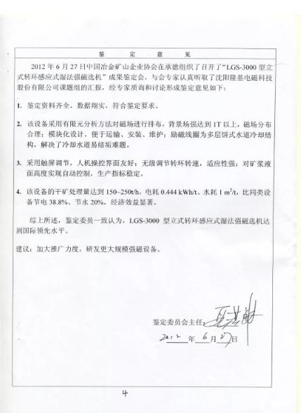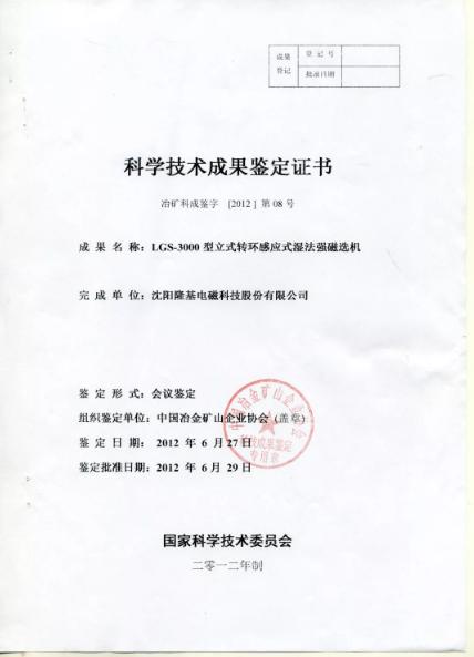 经国家技术科学委员会认定,隆基LGS系列立式转环感应式湿法强磁选机达到国际领先水平,在强磁选机的技术进步上具有划时代意义。